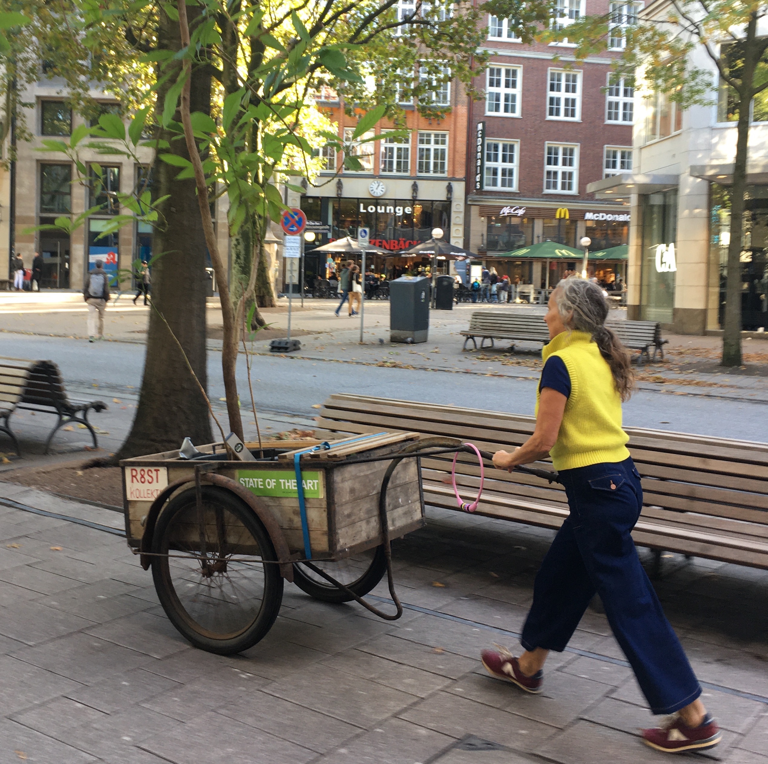 Zur Ausstellung wurde eine Pflanze, mit der wir seit etwa 25 Jahren zusammen leben, mit einem Handwagen durch die Stadt transportiert. Zusammen mit weiteren Pflanzen aus unserem Bestand wird sie Teil einer Installation aus Laboruntensilien zur Herstellung eines selbst bestimmten Eindrucks, einer Reihe von selbst gebauten Sitzhockern, einigen Spielkarten, Anleitungen und Handreichungen zu Fragen die das Leben und Verhalten des Menschen auf dem Planet Erde betreffen.
