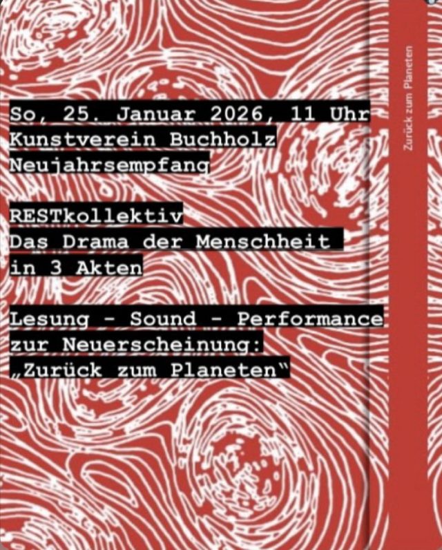 Zum Neujahrsempfang des Kunstvereins Buchholz lesen und performen Brigitte Raabe und Michael Stephan aus der Neuerscheinung des Kollektivs „Zurück zum Planeten“. Sound-files von Johannes Miethke mit Kontrabass und zwei Stimmen. Sonntag, 25.01.2026 – ab 11 Uhr.