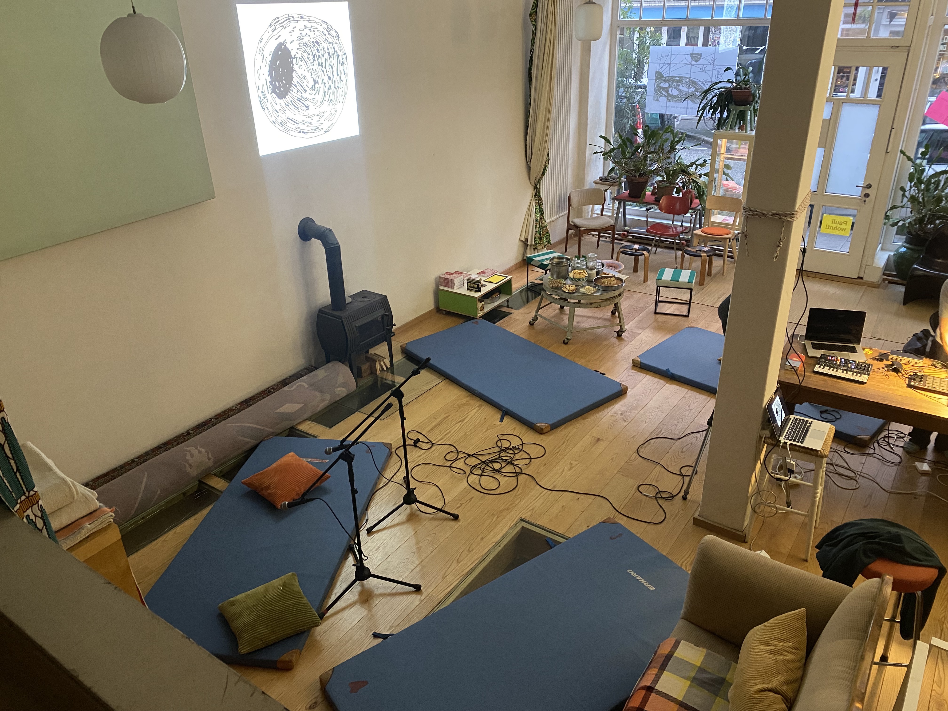 In unserer Sound-Installation arbeiten wir u.a. mit Texten aus unserem in Kürze erscheinenden zweiten Planetenbuch „Die Rückkehr zum Planeten“. Dabei kollaborieren wir wieder mit Johannes Miethke, der den Planeten-Sound aus verschiedenen Stimmen/Satelliten für den Raum komponiert hat. Die verschiedenen Sounds und Stimmen verteilen sich auf einzelne kleine autonome Lautsprecher, die in und unter unterschiedlichen Objekten ihren Platz finden.