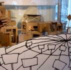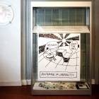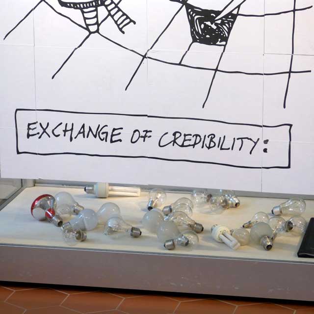 Zwei Glasvitrinen in einer Gruppenausstellung werden mit Ausdrucken und Gegenständen gefüllt. An einem Tag wird eine Performance mit gleichem Titel aufgeführt.